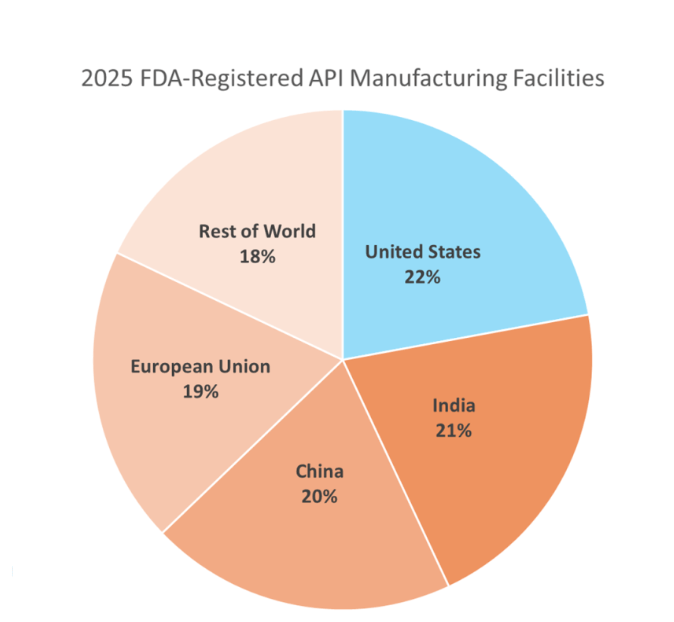 The United States is the largest pharmaceutical market, importing $178 billion worth of pharmaceutical products in 2023 and totaling 22% of the global market for pharmaceutical import Comtrade. Its heavy reliance on offshore API manufacturing, especially in China (20% of FDA-registered API facilities) and India (21%), has created strategic vulnerabilities.